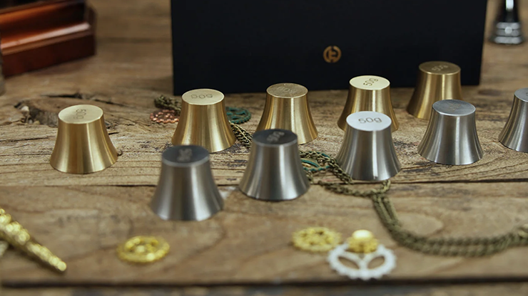 This classic set is a sophisticated variation of Dai Vernon's original Chink-a-Chink weights. We have elevated the craftsmanship and added an extra silver version. This addition expands the possibilities, allowing this nearly century-old classic to find new vitality in the contemporary magic scene.