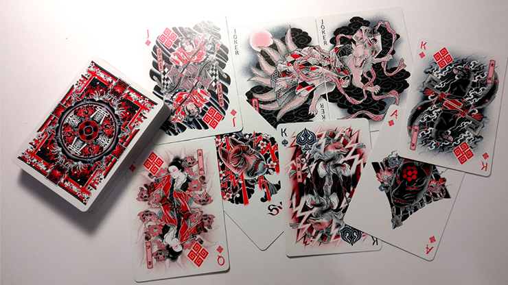 In Kitsune, we continue to translate and transform the traditional Japanese tattoo art form of Wabori into playing card style, retaining as well as enhancing many of the interesting and delightful features we had in Sumi Playing Cards. The focus of Kitsune centers around the fox spirit, a staple in Japanese folklore. We scoured many different sources of folktales, stories and myths about fox spirits and selected a few well-known ones as sources of inspiration for the characters in the Court cards. Kistune continues to serve as an homage to Wabori and faithfully represents the visual nuances and quality that is the hallmark of the Japanese traditional tattoo once again. This creates a visual playing card masterpiece like no other -- a masterpiece that weaves fantastical stories of begone times with modern playing card aesthetics.