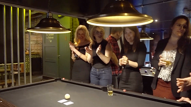 The magician explains he has two decks, one red the other blue. He places the blue deck aside explaining he will come back to that deck later. The other (red) deck is then opened and shuffled by the spectator, never touched by the magician at any point throughout the routine. Once shuffled and seen to be all different, they are then spread face down by the spectator all over the snooker/pool table, covering as much of the table as possible. The white snooker ball is then used, with any starting point chosen by the spectator, hit anywhere on the table, thus randomly selects a playing card. The card the white ball lands closest to is the one that will be used for the effect. The spectator can even have the choice to hit the ball again if they wish to select another card, it really is that free. All other surrounding cards are removed and the selected card is moved to the center of the table, still face down by the spectator. You never touch the selected card. The other deck now comes into play. The deck is opened and spread, with one face down card seen. This is also placed face down onto the center of the table, next to the other card. One blue back and one red back card are now facing down on the table. Both are turned over by the spectator and are seen to match. The card randomly selected by the spectator with the white ball matches the one and only face down card in the other deck.