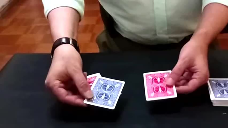 A card is selected by the spectator and is placed in the middle of the deck perpendicularly. Then, the same chosen card is removed, but from a deck of a different back color. The magician holds this card and in plain sight.