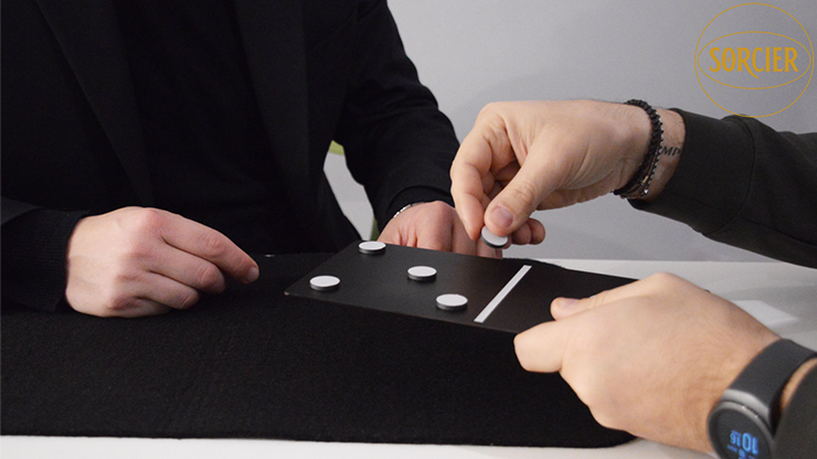 Show a black metal plaque with a white line drawn on it. 6 magnetic white discs are attached to it. Now ask a spectator to move from the first side to the second as many dots as he wishes.