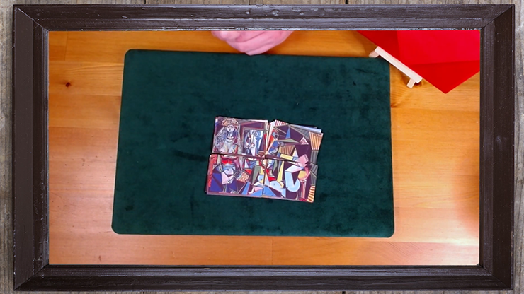 Package includes EVERYTHING you need to do the routine, plus a spare set of cards to do Mike Breggars version (which has a different method and more pieces), instructions for both routines (the first version on streaming video, and Mike's one as a bonus PDF) plus the mysterious red envelope AND THE MINI EASEL!