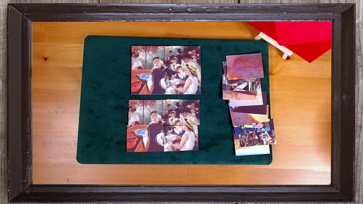 'Not only that!' you say, 'but sometimes they come together to make a masterpiece...' you turn over three of the pieces to show they are all from the same picture! Allowing the spectator to turn over the last piece - it doesn't match!