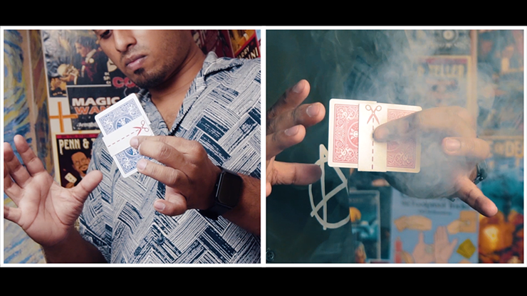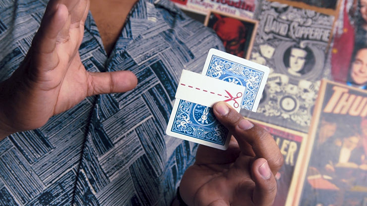 A card is selected by the spectator and a piece of cardboard with a dashed cutting line is folded around the center of the chosen card - with just a snap of your fingers the card seems to be magically cut in half without any moves or whatsoever as you slide the top half of the card aside... Magically and visually the top half begins to move on its own and eerily slides back into position only to reveal the fully restored card.