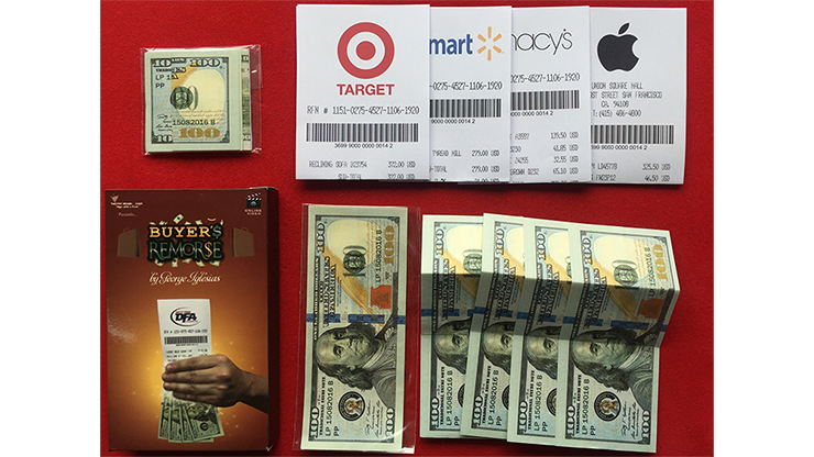 You show a receipt in your hands. You fold it twice and turn it over and just like magic, you're holding a bunch of bills that you can fan out front and back and count individually. Creator, George Iglesias, pays tribute to his magic mentor, the great José "Pepe" Sousa, with this very visual magic trick that you can also make up with your own money and receipts! Buyer's Remorse comes with a gimmick already made for you with 4 realistic-looking hundred-dollar bills. It's very easy to do. Take it out of the pack and you will be doing this right away!