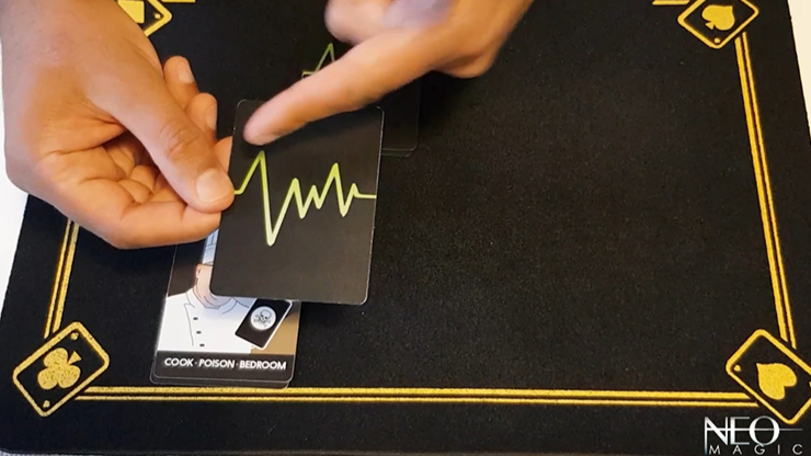 You show eight cards with two potential culprits, two murder weapons and four different rooms. The spectator MENTALLY selects one card with a Culprit, Weapon and Room.