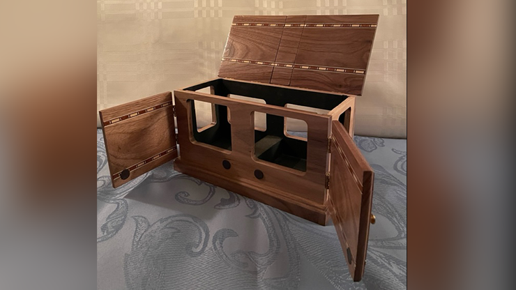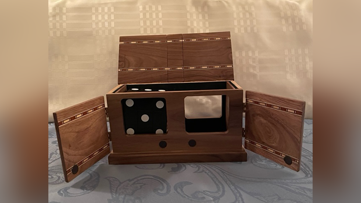 The Karpinski Die Box (Folding Die Version) allows for the teleportation of a jumbo sized die from an ornate box to any location you choose. The apparatus included and the routine described constitute a complete routine for the performer. To add an additional magical element to the routine, the Karpinski Die Appearance apparatus has been designed to work in tandem with the Folding Die Box. It is constructed of a matching wood and allows for an elegant reappearance of the die in an impossible location that has been seen empty and remained isolated during the routine.