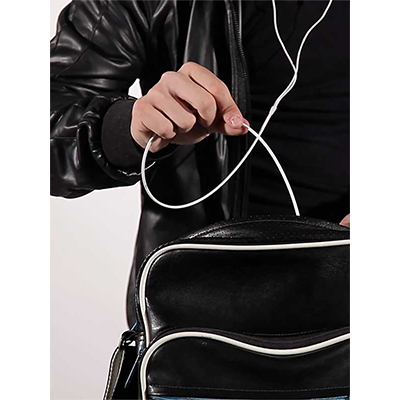 The classic effect of borrowing a card reinvented by G Alexander for the 21st Century. The magician comes in listening to his favorite music on his headphones. A spectator chooses a card and loses it again. The entire deck of cards fall into a backpack and it's shaken to mix the cards up. Now, the magician removes his headphones and inserts the cable into the backpack. After a few seconds, the magician pulls out the cable revealing to everyone's surprise that the cord is knotted around a card which turns out to be the chosen card.