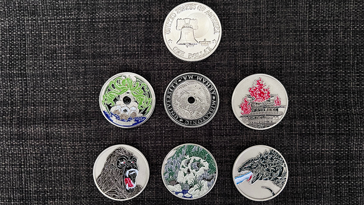 Kaiju Coins is a TEN coin set of dollar sized coins with beautiful artwork and matching GAFFS. This set comes with three monster-themed coins, matching shells and double sided coins.