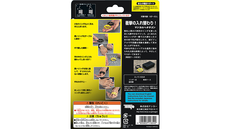 This snappy trick uses two hexagonal rings, one yellow and one black. Each ring is punched with a series of holes. After showing the front and back of each ring, they instantly change places and change color in increasingly visual and surprising ways. You will be able to master this trick in no time flat, thanks to the clever method and bold principle built into the simple props. (Carry case included)
