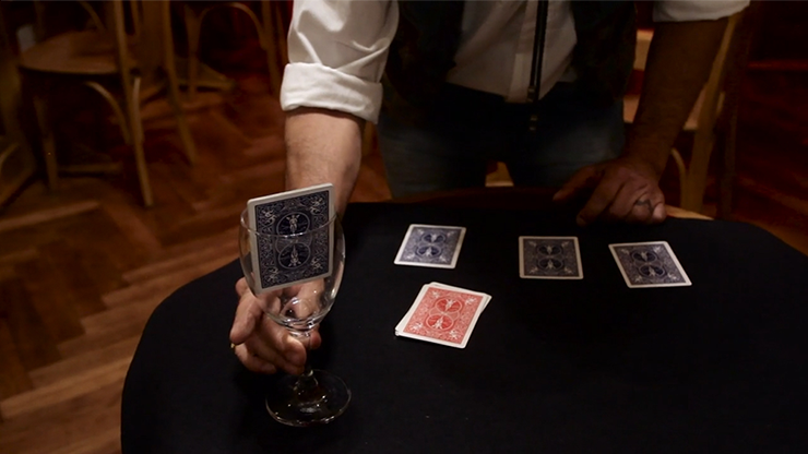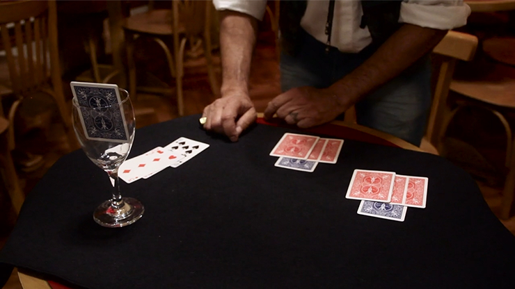Have a spectator sign the 4 Aces from a blue deck. Nine cards are removed from a red deck. One of the Aces is placed in a wine glass, with the back facing the audience. Three piles are created on the table, each comprising three cards from the red deck and an Ace. One by one, the Aces are shown to have vanished from those piles! The glass is now found to contain all four signed Aces!