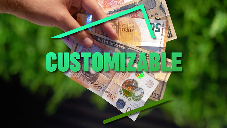 The gimmick comes ready to go, and it is fully customizable to any currency in the world. The customization will take you less than 1 min. to do. You will also get extra material for the customization with fake bills of many different currencies, so you don't need to rip any of your bills.