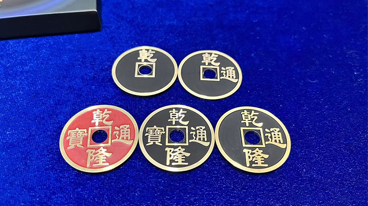 You display two coins, one black and one red, both of which are inscribed with the four Chinese characters: 'qian'/'long'/'tong'/'bao'.