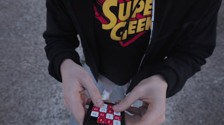 An instantly recognizable number puzzle game is handed to a spectator to mix up. The magician then "memorizes" the position of the numbers and turns the puzzle face down as he attempts to solve it without looking. Despite there being almost 20 trillion different combinations, the magician is able to solve the puzzle.