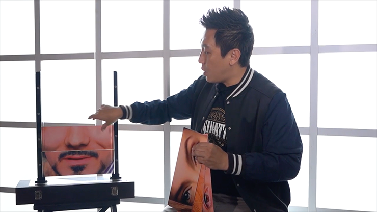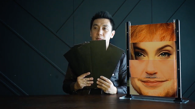 'EFFECT: 3 celebrity photos each cut into 4 parts: forehead, eyes, nose and mouth. So there are 3 sets of foreheads, 3 sets of eyes, 3 sets of noses, and 3 sets of mouths. The spectator then randomly chooses a part of the face from each set. There is less than a 2 percent chance that it will be a correct set. The result, of course a messy-mixed set that looks funny. But what they don't know, that the messed up face have a secret image behind it, which compose a whole new complete face, whilst the rest of the unselected parts are blank on the back.