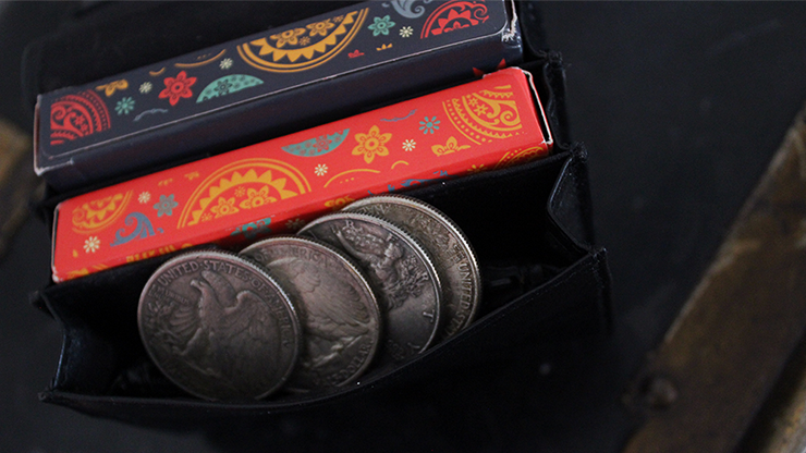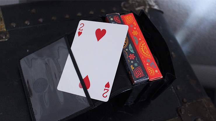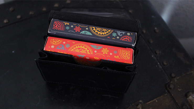 Holds two decks, four half dollars, 4 packet tricks, and business cards Made of high quality leather Includes clip for easy attachment to belt or briefcase Fits in your pocket or stands upright on a table
