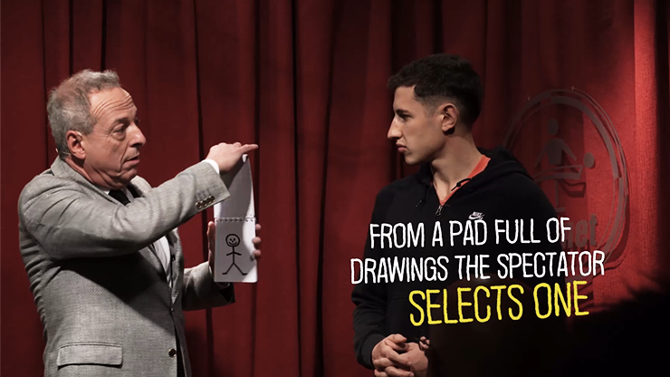 Then, the mentalist moves on to another spectator and reminisces about drawing on the blackboard during elementary school. The mentalist shows that the pad is filled with various drawings and asks the spectator to choose one without revealing it to anyone. The spectator looks at a drawing and imagines themselves drawing it with a piece of chalk.