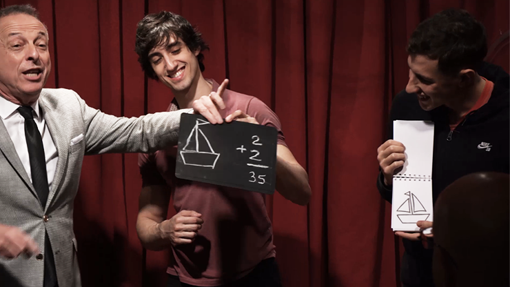 "Picasso said 'Everything you can imagine is real'", the performer takes out from the envelope, that was in plain sight the whole time, a slate and shows that has written precisely "2 + 2 = 43" and has a big drawing of a boat!