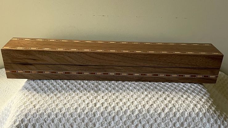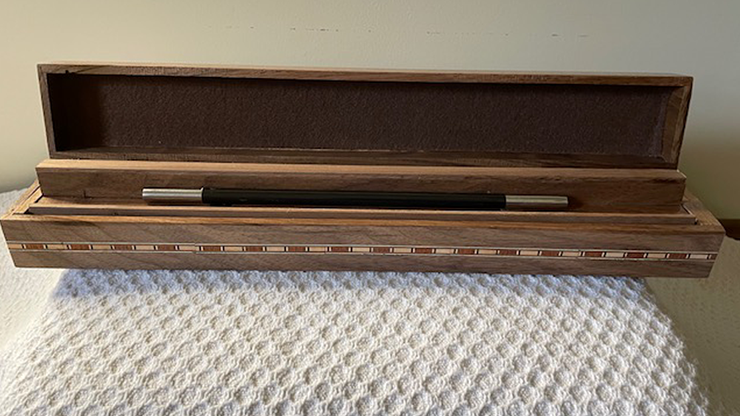 The Karpinski Diminishing Wands is a new take on a classic trick that can be used as a utility device over the course of multiple effects. The performer displays a handcrafted hardwood case for a magic wand. Upon opening it, a full-sized wand is revealed. The wand is used for the current effect and is returned to the box; which is placed in view to the side. For the next effect, the box is opened and the wand is removed but it has shrunk to a smaller version of its original size.