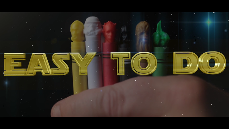 The spectator freely chooses any one of six crayons from a crayon pack and is then asked to think of something associated with that color. Using magicians stealth and the Jedi "force" the spectator chooses a character from Star Wars that corresponds to the chosen color of crayon.