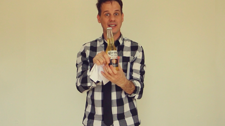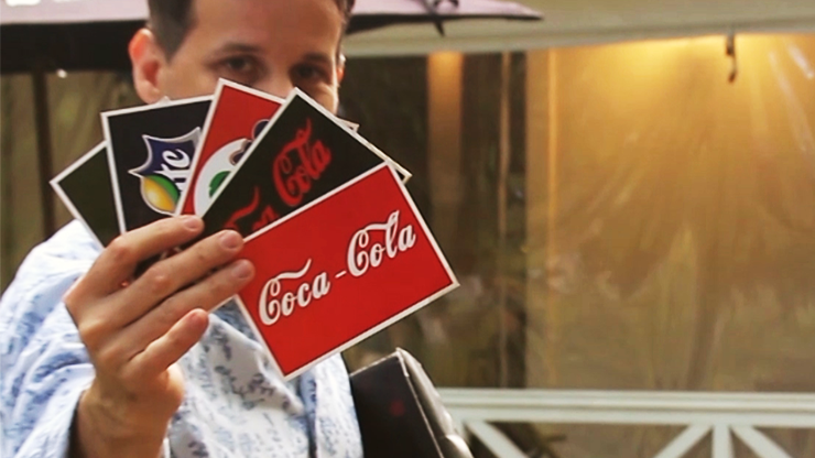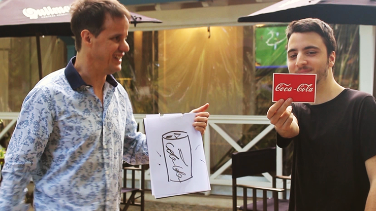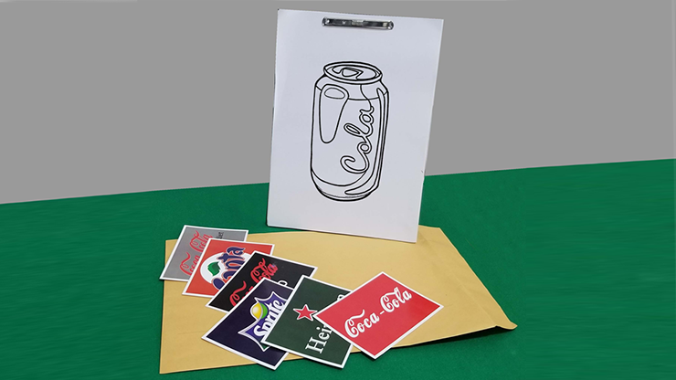 Various cards with images of drinks are shown. The spectator chooses one, then the magician takes from an envelope a giant pad of paper, saying that he will guess which drink the spectator selected. The magician draws a can with its corresponding logo coinciding with the one chosen by the viewer!