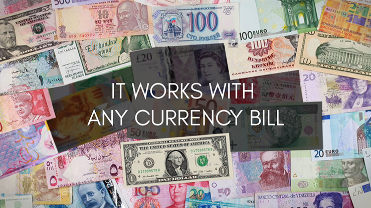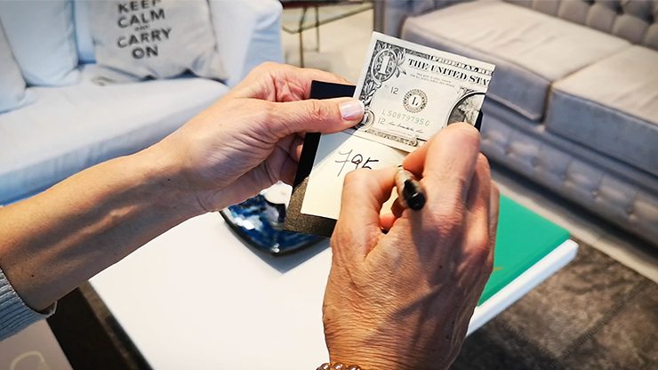 It is specially designed from a super resistant plastic with leather finish. You can refill as many times as you need with standard size sticky notes. It is very easy to perform, it works with any currency bill, and you can present it in close-up or for large audiences.