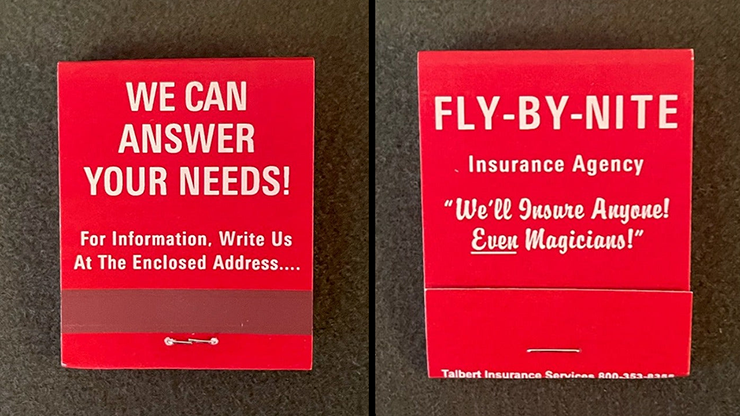 Match-out is a humorous variation of the popular Insurance Policy trick. The standard insurance effect is this: A person selects a card and the magician fails to discover its identity. Fortunately, he is covered by an insurance policy or by his attorney. Upon examination, the street the location of the business matches the actual card they selected!