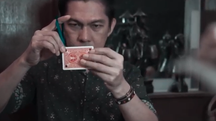 The magician punches hole in three corners of a playing card using a puncher. A ribbon is tied through one hole and the ends knotted together. The card now hangs from the ribbon. With no dodgy hand or finger movement, the magician moves the ribbon from one corner hole to another by sliding it through the space between the holes. He does it twice.