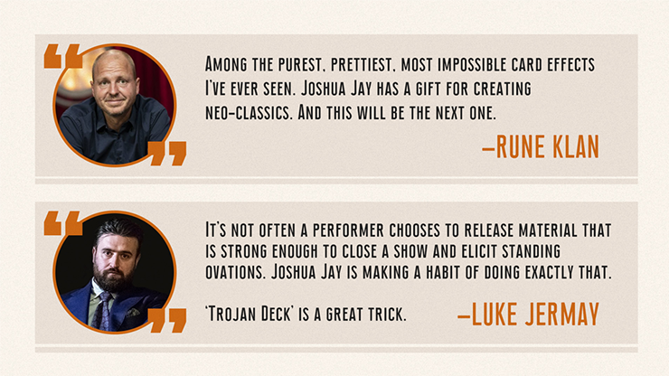 "It's not often a performer chooses to release material that is strong enough to close a show and elicit standing ovations. Joshua Jay is making a habit of doing exactly that. 'Trojan Deck' is a great trick. However, more than this it is an exciting tool to bring many new, exciting and radically fooling ideas to life. Its method is one I have enjoyed exploring and applying far and wide ever since I learned it. I think you will too." - Luke Jermay