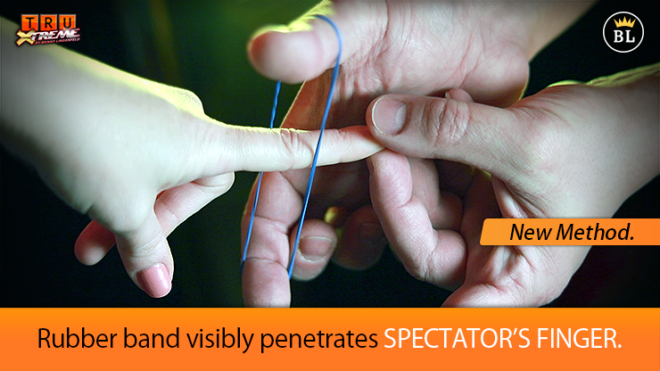 While a spectator holds your fingertip, a rubber-band visibly links ON & OFF your finger. The band penetrates through your finger in the most visual and impossible way.
