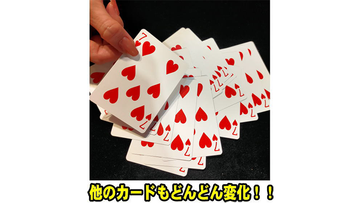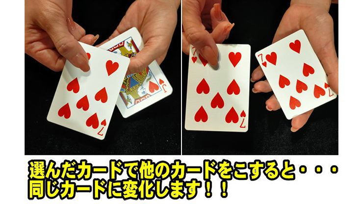 A card is chosen from the deck. The card you chose is the 7 of Hearts. The magician holds the next random card from the deck in his hand and rubs it on the 7 of Hearts. The random card changes to a 7 of Hearts! The second card turns into a 7 of Hearts when rubbed in the same way. If you look at the rest of the cards in the magician's hand, they will turn into 7 of Hearts as well! Furthermore, if you rub the remaining stack of cards, all the cards will turn blank.