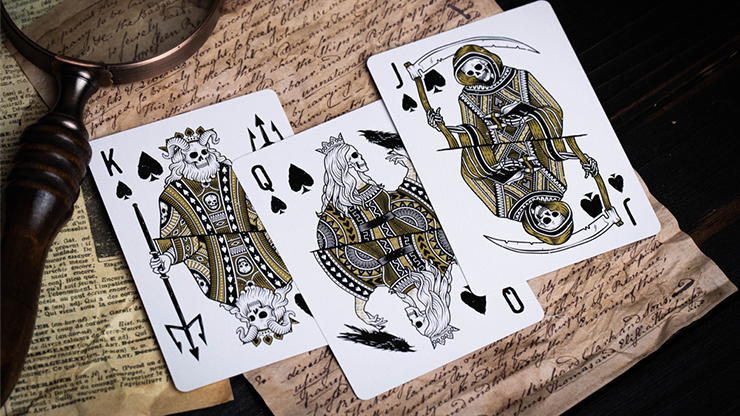 Inspired by the Devil's number 666 and the mysterious occult practices. On the first look, the overall design is very simple, the deck enveloped in dark colors. Yet when you hold the deck to the light, the whole box lights up with intricate details that were hiding in the shadows.