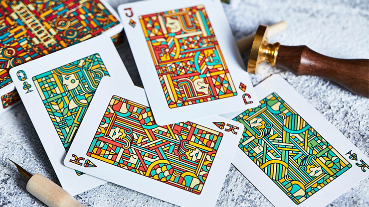 The images are cleverly broken down into multi-faceted geometrical grits. Each shape is filled in with a pop of basic colour, encircled with a thick outline, giving the whole design a look of stained glass of a cathedral. However, this deck is far from being as motionless as a glass panel. In fact, all of the small details come together in a dynamic design that is sure to attract many looks.