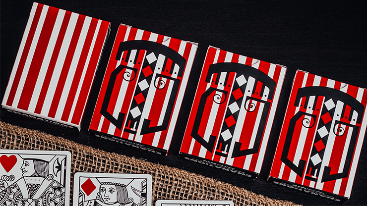 The crimson red on white Mondrian back design is stamped with Charles T. Jordan's Monogram to represent the sacred union between the modern and the primitive. These seemingly prehistoric pasteboards evoke a sensation of timeless elegance.