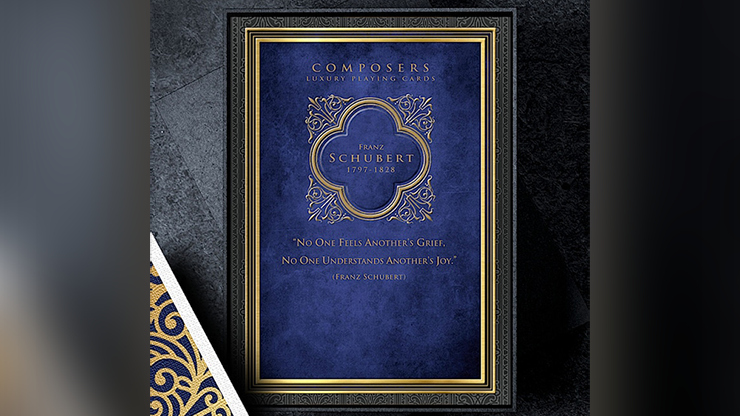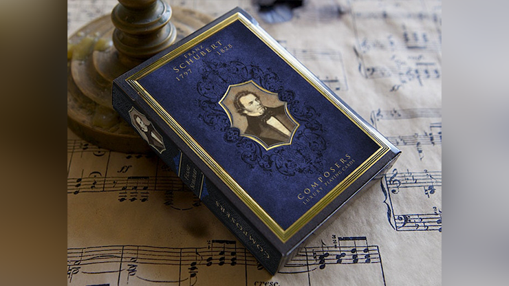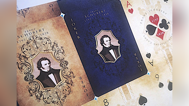 Franz Schubert Playing Cards, designed by SixtyFourPlayingCards, is a unique and elegant deck of playing cards for collectors, where the protagonist is one of the greatest Composers of classical and symphonic music of all time - Franz Schubert. The theme of Schubert is dark blue, and will be the color of the theme of the tuck box, the back of the cards and the color theme of court cards.