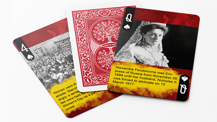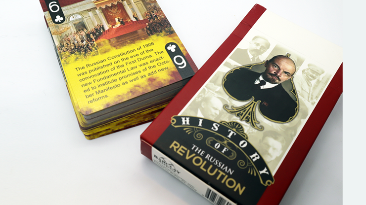 This deck contains 56 cards printed on Casino quality stock. The deck acts as a micro-history book with each card containing information about the History of the Russian Revolution.