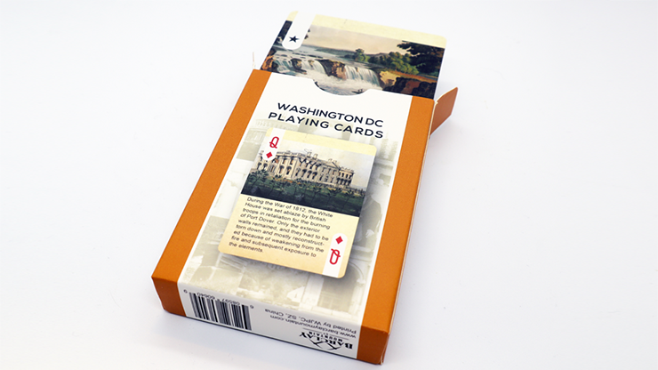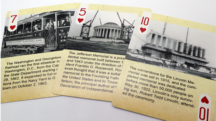 This deck contains 56 cards printed on Casino quality stock. The deck acts as a micro-history book with each card containing information about the History of Washington DC.