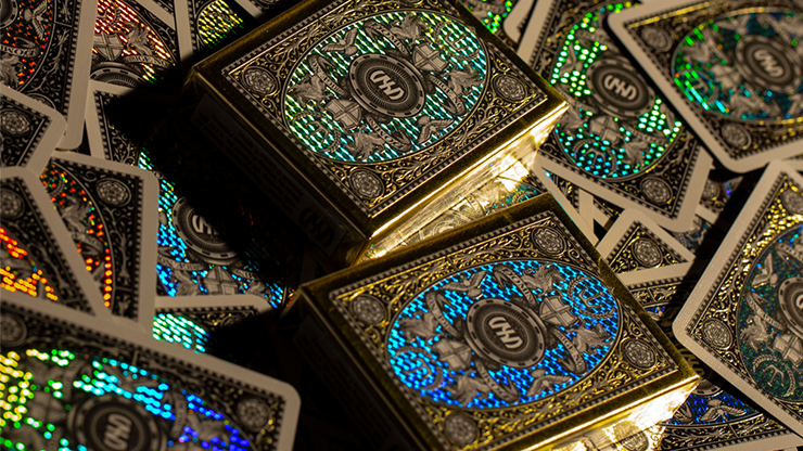 The Gold Deck showcases a layer of individual custom transparent holographics on every card front, plus a metal-backed and patterned holographic foil on the card backs. An additional gold metal foil layer on the card backs finishes off the intense luxury look.
