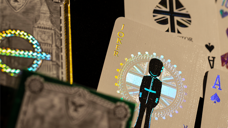 Presenting the second in the Diffractor City Series, VXD Gaming brings you the London Diffractor. Designed by VXD Gaming and Lance T Miller and produced by Vrijdag Premium Printing, the London Diffractor decks use the patented printing technology developed by VXD Gaming (US. Patent. No. 8,777,225), which combines a standard layer of ink printing, as found on normal playing cards, with an additional hot-stamped layer of transparent holographics, of the type typically only found on passports and other ID documents. This combination produces an entirely unique look within the playing cards industry and presents new possibilities for design expression and sets a new bar for luxuriousness. The result is a mesmerizing combination of holographics and ink, lighting up at different angles and in different lighting conditions and producing a combined artwork which tells a story of the heritage of London.