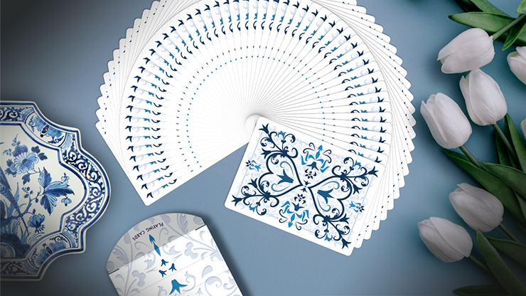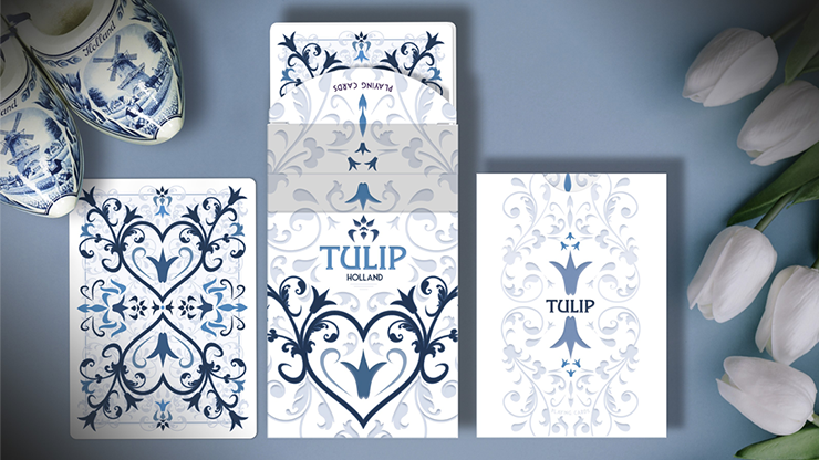 Inside you find The White Tulip deck, the 3rd instalment in the Tulip Delft Blue series. The custom-designed deck features the renowned Delft Blue colors with the Tulip as the center piece.