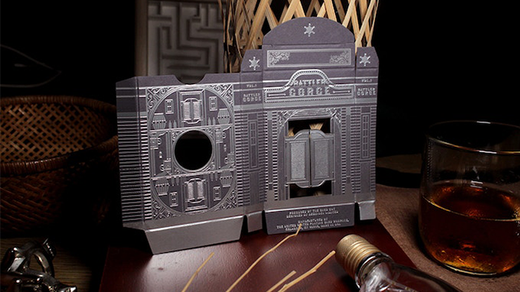 The Noir version features black and white tones that pay homage to the silver screen movies that turned the stories of the old west into legend. With a black tuck case highlighted by silver foil, this version represents a striking contrast. And of course, it includes the distinctive cutouts of its sister deck, allowing you to peek in on design elements of the cards within. The entire tuck is meant to be an experience to enjoy, capturing the feel of the buildings of the old west and giving you a truly unique way to enjoy your deck!