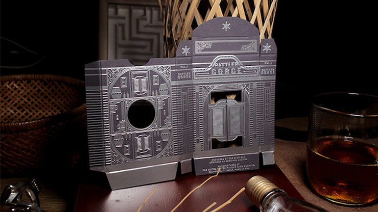 The Noir version features black and white tones that pay homage to the silver screen movies that turned the stories of the old west into legend. With a black tuck case highlighted by silver foil, this version represents a striking contrast. And of course, it includes the distinctive cutouts of its sister deck, allowing you to peek in on design elements of the cards within. The entire tuck is meant to be an experience to enjoy, capturing the feel of the buildings of the old west and giving you a truly unique way to enjoy your deck!
