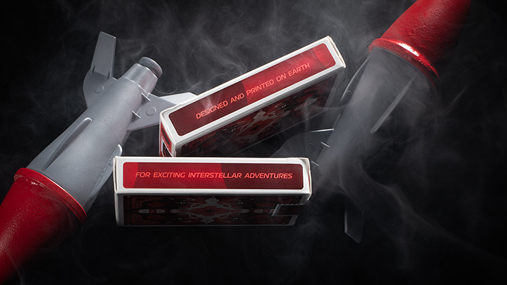 Buckle up for a blast from the past with Bicycle Retro Rocket Playing Cards! These cards celebrate a time when space travel was the stuff of dreams - zipping off to worlds unknown to create vast floating cities in the skies. Designed by Douglas Fuchs, the Retro Rockets are covered in fully custom artwork. The backs have rockets blasting off from a Martian metropolis, and rockets are featured on the Jokers as well. The court cards are all astronauts, while the number cards feature custom suit pips.