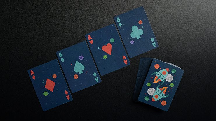 The faces have a deep blue space background, custom pips, and custom court cards that feature child astronauts. Even with all of this new artwork, the deck is still highly playable. The deck includes two rocket ship jokers and two bonus gaff cards.