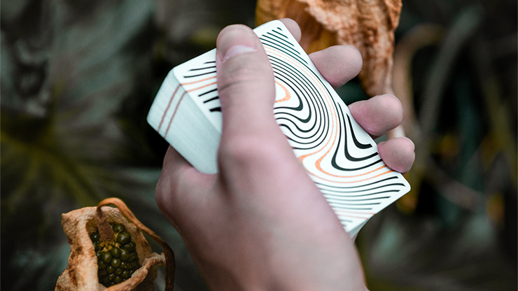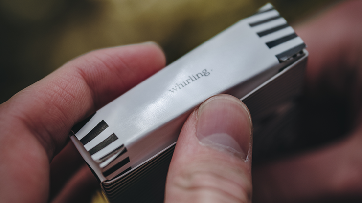 whirl. has a distinctive theme in its connection to magic and cardistry. whirl.'s design has gold pantone lines. Its beautiful faces in black and gold have been created so cardists can flourish and magicians will excel in their routines and tricks. The card back includes the whirl. and leads to magic effects and 'whirling' cardistry. The faces are held in a very straight and calm way to increase the enthanting moments of silence.