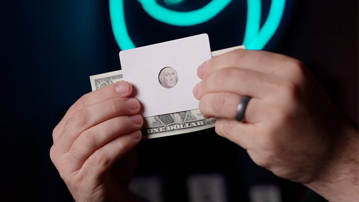 The HOLE CARD is placed over the DOLLAR BILL showing George Washington's face. Without any moves you slide Georges head up to the top of the bill, then across to the right and then to the left. Finally you slide his head back onto his shoulders where it belongs. Immediately hand back the borrowed bill and show the card on both sides.
